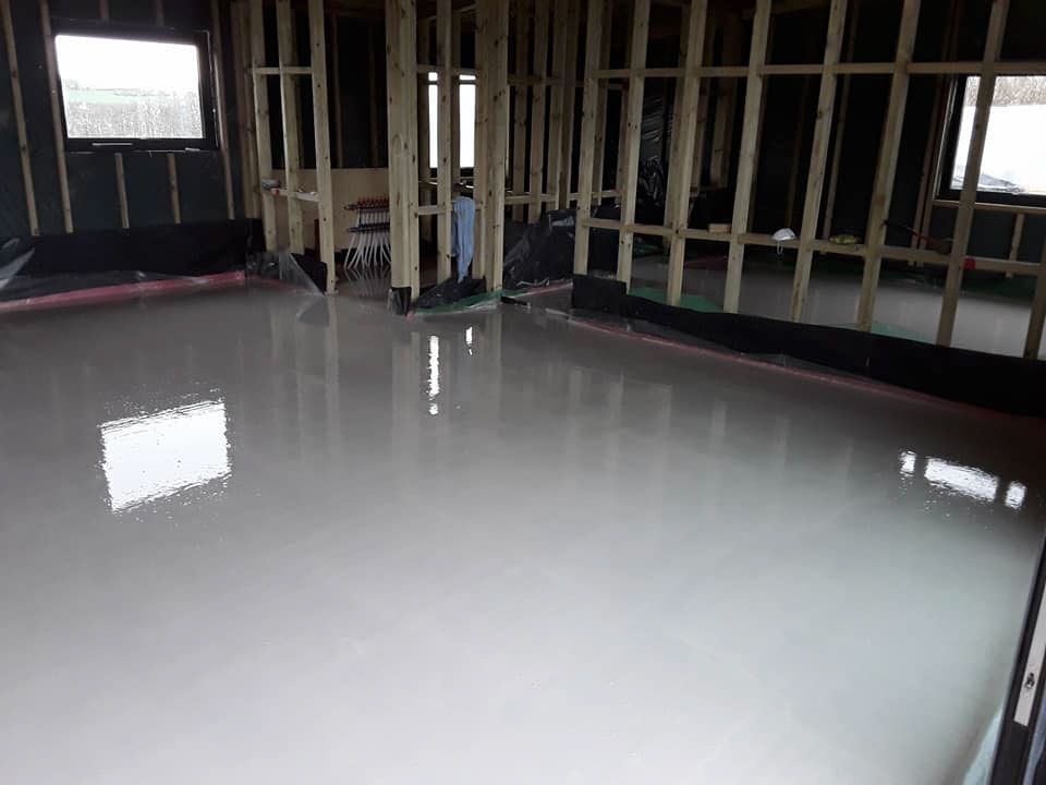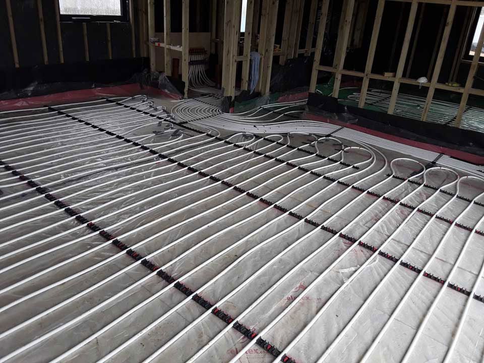 Liquid anhydrite screed used along with under floor heating. Each room installed with it’s own programmable thermostat.